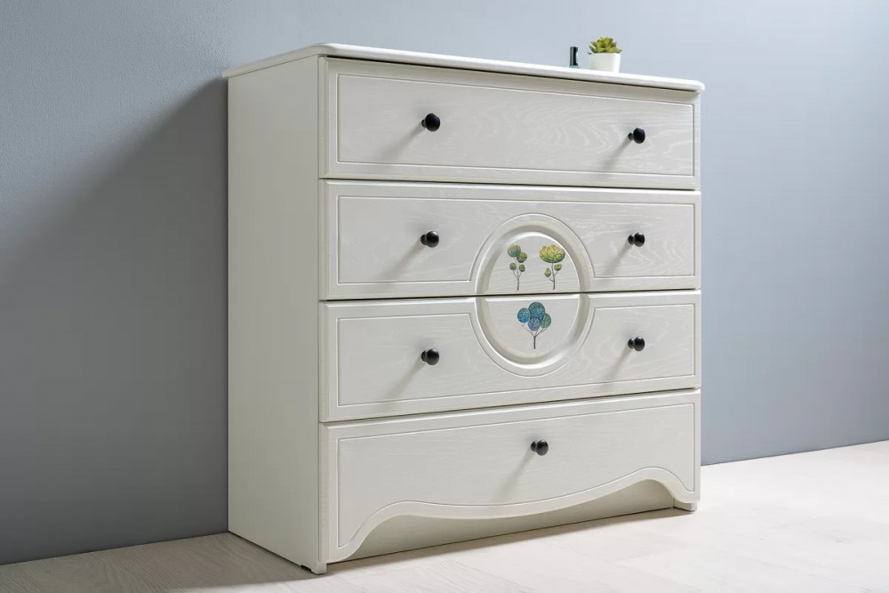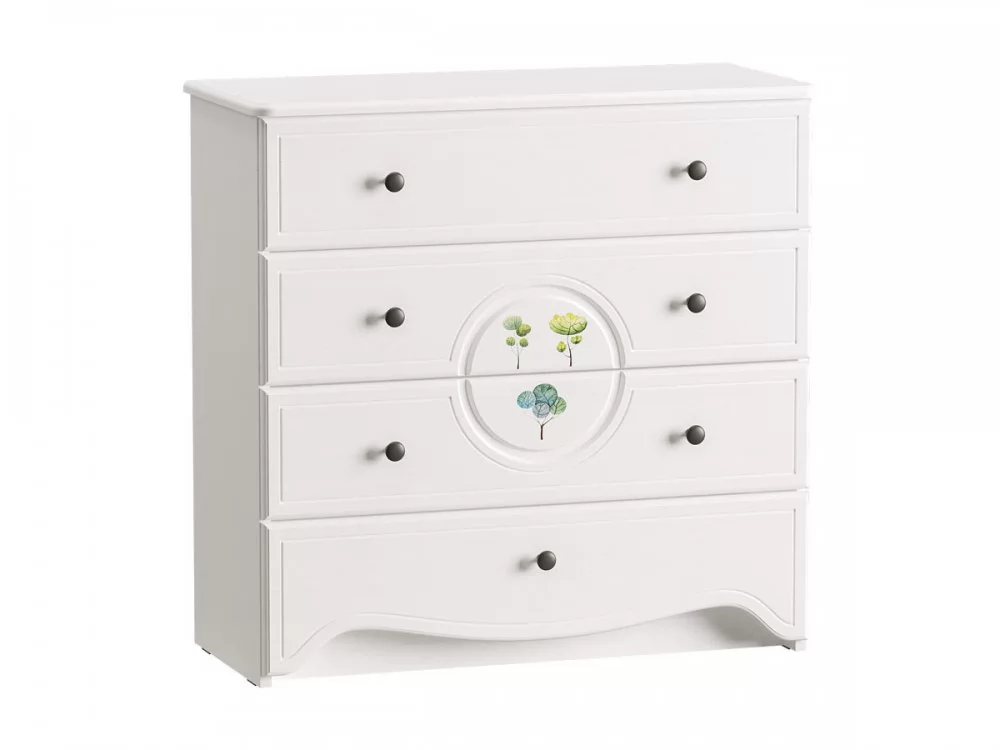 Комод Роуз 13.297 прекрасно впишется в интерьер детской комнаты, а также привнесет яркие нотки. Теперь у ребенка появится дополнительное место для бережного хранения одежды и нижнего белья, разнообразных аксессуаров и игрушек. Комод оснащен четырьмя выдвижными ящиками. Сверху на комоде можно разместить несколько памятных фотографий и оригинальные предметы декора. Декор и рисунок на фасадах способствуют созданию сказочной атмосферы.