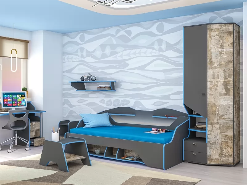 Для тех, кто ценит индивидуальность и не боится быть уникальным - предлагается молодёжная модульная система Индиго. Здесь нестандартно всё: геометрические формы, стиль, декоры. Такая мебель может стать акцентом в любом интерьере. Компьютерный стол имеет поддержку для локтей, светодиодную подсветку и подготовлен для укладки проводов компьютера (в столешнице предусмотрены заглушки). Кровать имеет вместительную выкатную систему хранения, светодиодную подсветку, функциональные приспинные полки. Часть деталей выполнена из ЛДСП толщиной 22 мм в ПВХ кромке толщиной 2 мм. Это надёжно и эстетично!