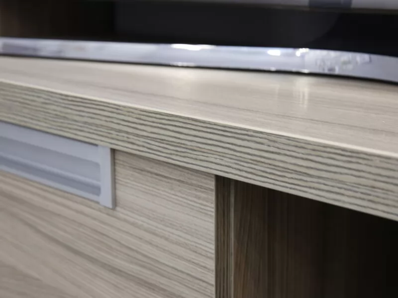 Модульная система «Честерфилд» Корпус модульной системы изготовлен из 38мм, 22 мм и 16 мм ламинированой древесностружечной плиты цвет «Шорвуд». Торцевые поверхности корпуса закромлены кромками ABS. Фасады изготовлены из 16 мм ламинированой древесностружечной плиты цвет «Шорвуд». Торцевые поверхности закромлены кромками ABS. В фасадах выполнена фрезеровка под ручку. - Петли четырехшарнирные с доводчиком плавного закрывания. - Ручки пластиковые врезные. - Стекло серого цвета. - Направляющие шариковые полного выдвижения. - Опоры пластиковые не регулируемые.
