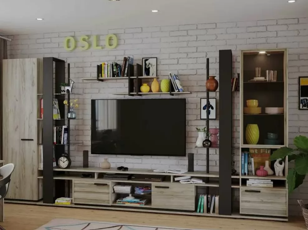 Мебель коллекции OSLO в стиле лофт позволит создать необычный интерьер в вашем жилье. Мягкий древесный декор и черные элементы в модулях гостиной OSLO идеально сочетаются друг с другом.