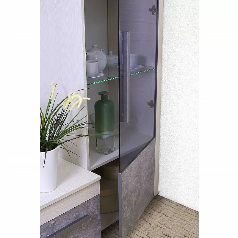Если вы считаете, что хранить в гостиной посуду уже не модно, шкаф со стеклянной дверцей и стеклянными полками станет отличной витриной для дорогих и любимых фотографий и памятных вещиц. Стеклополки в обработке еврокромкой выдерживают до 10 кг каждая. Фасад перенавешивается на левую и правую сторону. Серебристая стильная ручка из массива дерева и серое тонирование стекло фасада вносят смелые дизайнерские штрихи в восприятии актуальноого декора "под бетон".