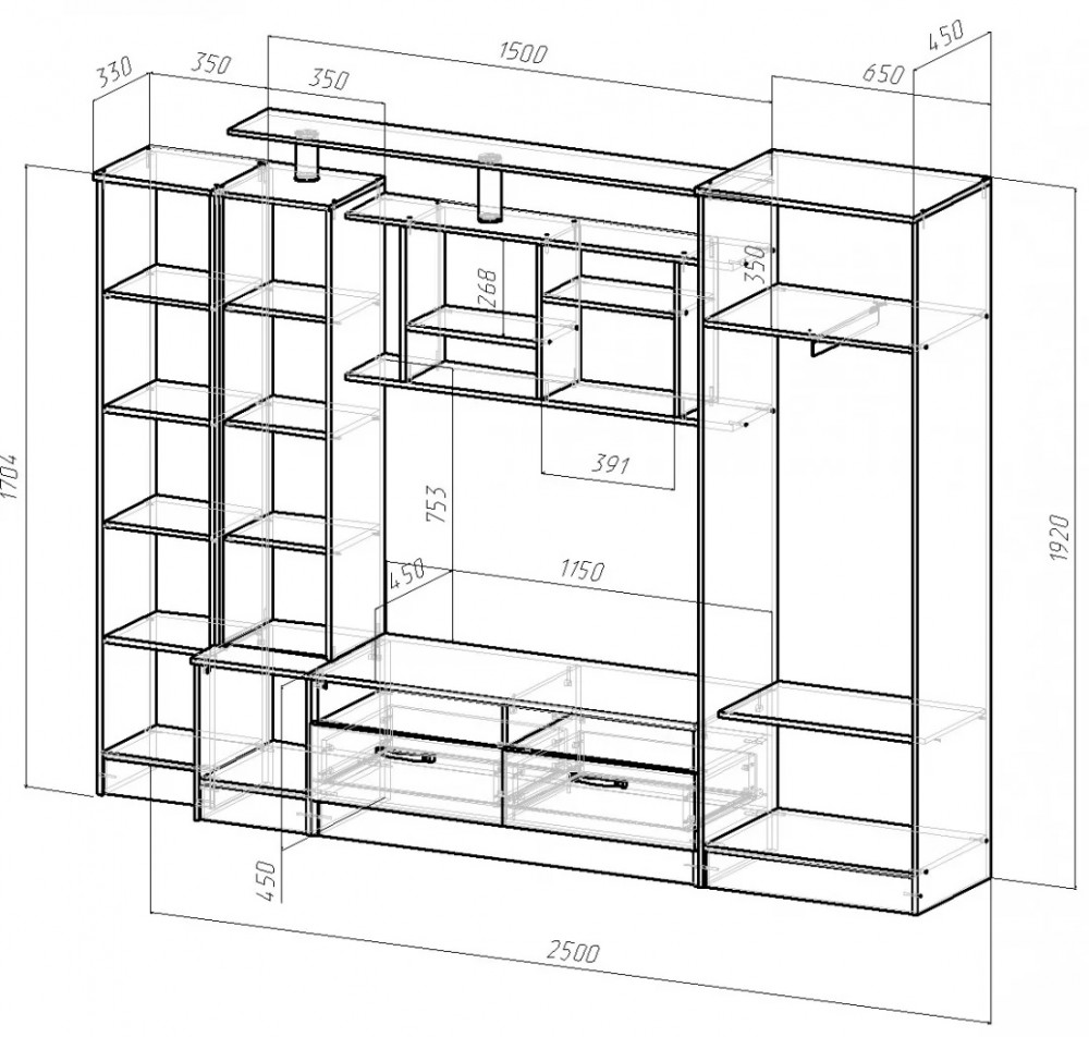 Габариты 2500(Ш) х 450(Г) х 1920(В) мм.