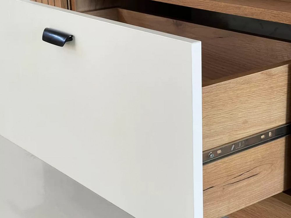 Состоит из: тумбы с дверями, выдвижного ящика и открытой секции.