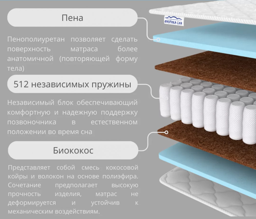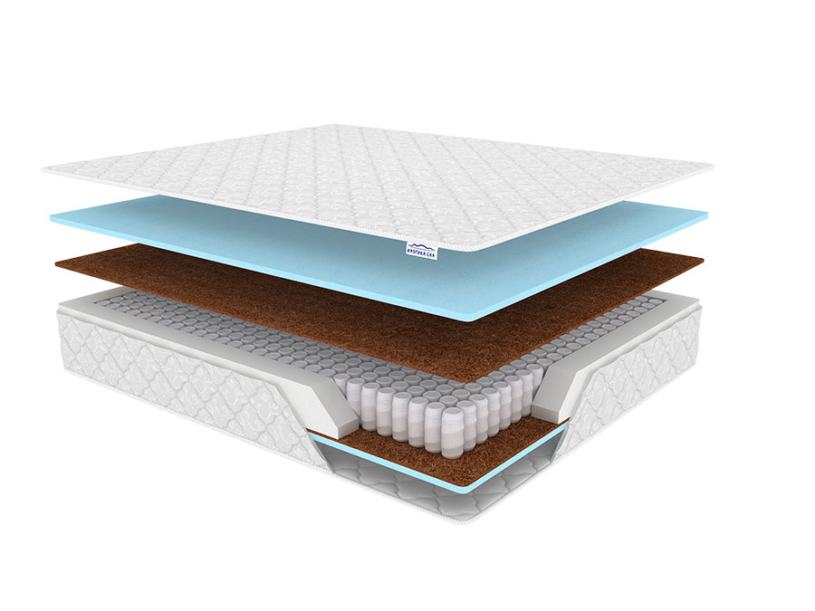 Состав: Пенополиуретан - 2 см/Био-кокос 1 см/Блок независимых пружин/Био-кокос 1 см/ Пенополиуретан - 2 см