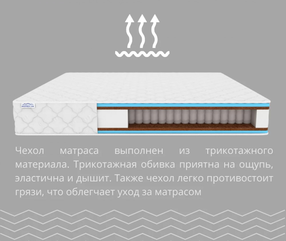 • Чехол в трикотажной обивке: Чехол матраса выполнен из трикотажного материала, легко снимается и стирается, что облегчает уход за матрасом.