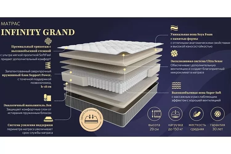 Матрас INFINITY GRAND 900*2000мм (Пена/лен, ср.жесткий, h 29см) в Мегионе