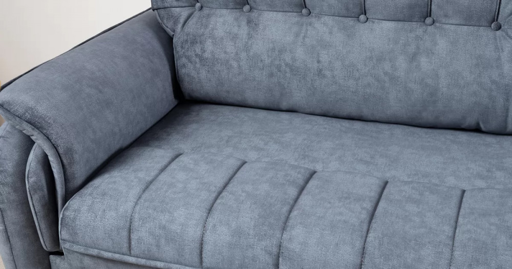 Декоративные канты на подушках дивана, подлокотниках и сиденье. Стежка на передней части сиденья и внешней части подлокотника. Защипы на верхней части подушки. Втяжки с пуговицами на приспинных подушках.
