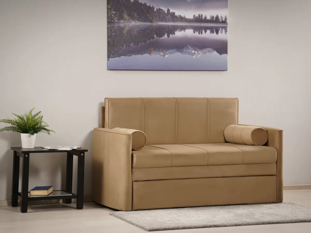 Диван-кровать Мелани Р (120) - компактный современный диванчик. Скругленные подлокотники с кантами подчеркивают эргономичность модели. Простой и надежный механизм трансформации на каждый день обеспечит удобным спальным местом ребенка или подростка. Может использоваться в качестве гостевого спального места для взрослого. Размер сп. места 195 х 120 см, есть небольшой бельевой ящик. Диван выполнен в мягком фактурном велюре. "Пальчиковый эффект" на ткани обивки выражен средне. Опоры - цвет черный, круглые, высота 25 мм., выполнены из высококачественного пластика. Прочность конструкции ножек обеспечена ребрами жесткости и внутренним креплением под фурнитуру.