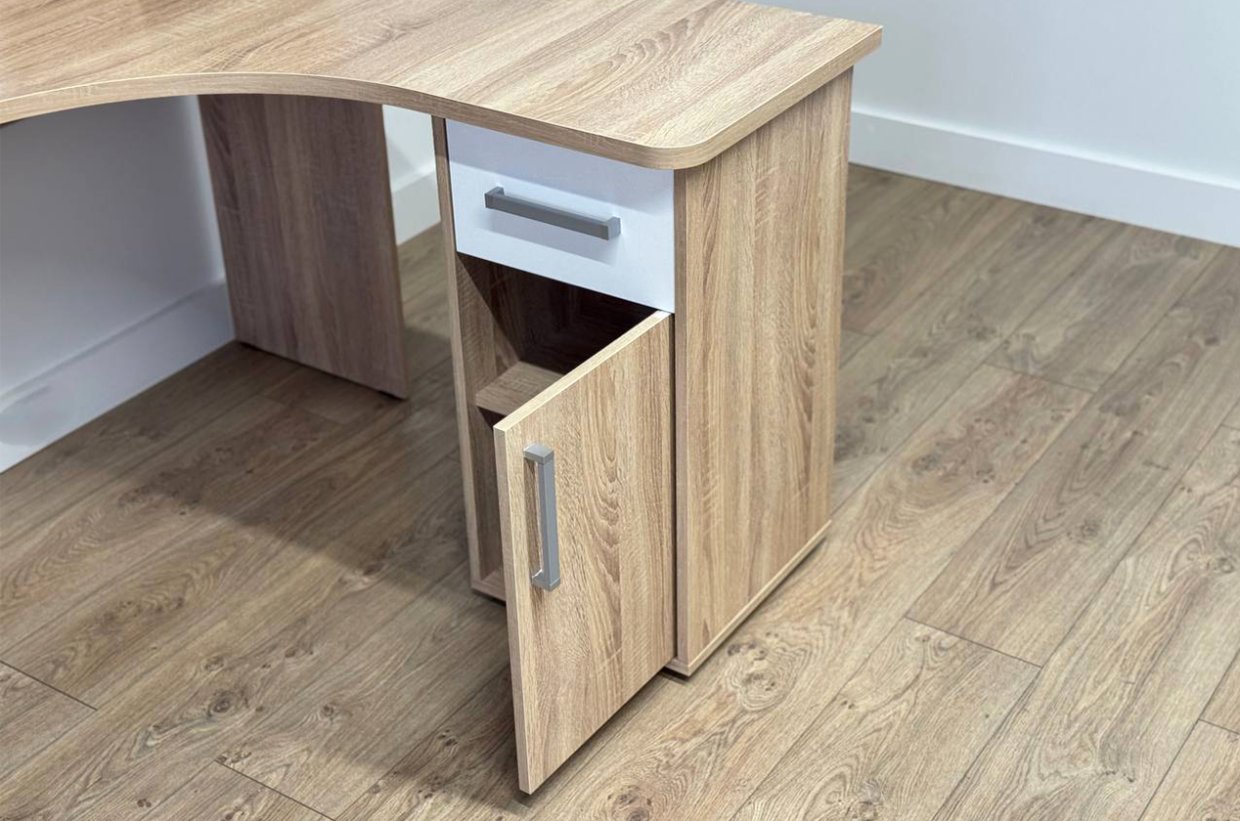 Угловой компьютерный стол «Лайт» поможет организовать рабочее пространство в комнате школьника или подростка, он удобно устанавливается в угол комнаты и не загромождает пространство, несмотря на свои габариты. У компьютерного углового стола «Лайт» в {{in_city}} большая рабочая поверхность: на нем можно легко расположит даже большой монитор, предусмотрено место для клавиатуры, системный блок удобно размещается снизу. Также в модели имеется тумба и выдвижной ящик, где удобно хранить учебные и канцелярские принадлежности, книги. Стол может компоноваться другой мебелью из линейки «Лайт».