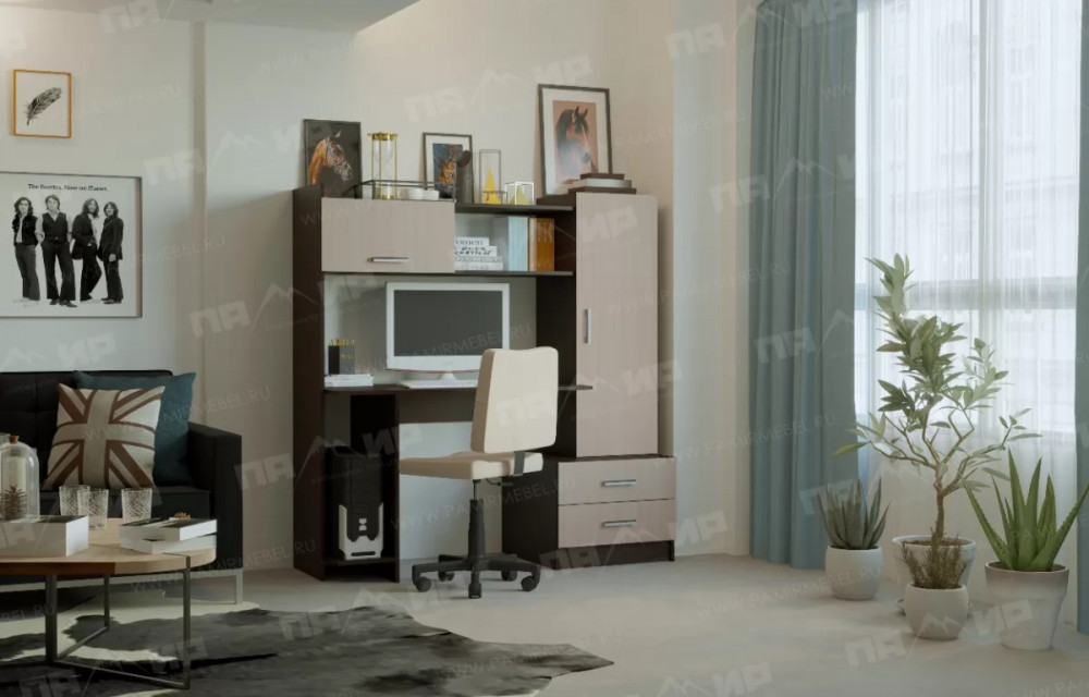 Компьютерный стол ПКС-7 - отличное решение для подростковой комнаты или кабинета. Модель укомплектована двумя ящиками на роликовых направляющих, вместительными шкафчиками с дверками, а также полками.