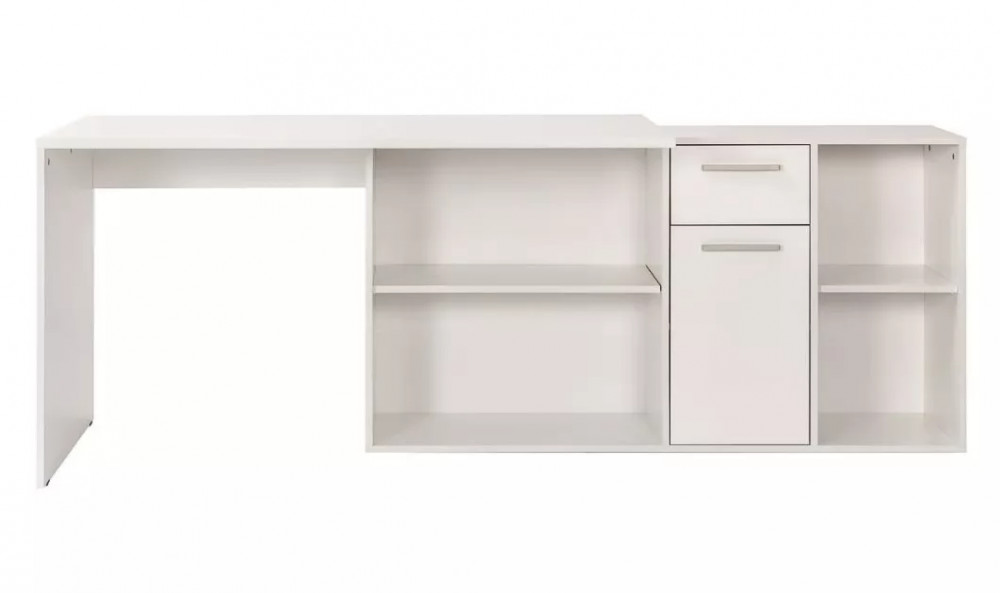 Универсальный рабочий стол, который можно собрать как в угловой, так и в прямой ориентации. Широкая столешница позволит свободно разместить ноутбук, настольную лампу и письменные принадлежности. Система хранения стола состоит из тумбы с четырьмя открытыми нишами разного размера, одного закрытого шкафчика с полкой внутри и выдвижного ящика.