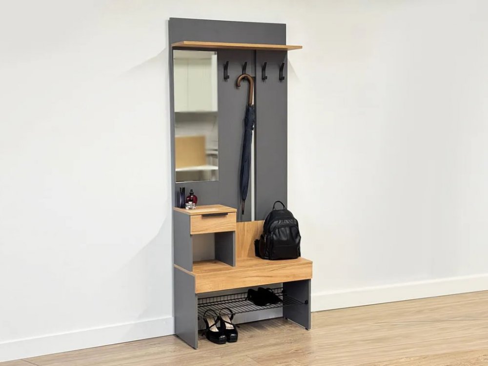 Крючки для одежды обеспечивают удобное место для размещения верхней одежды и аксессуаров, а выкатной ящик предоставляет дополнительное пространство для хранения мелочей. Сетчатая полка для обуви позволяет аккуратно разместить обувь, обеспечивая вентиляцию и легкий доступ.