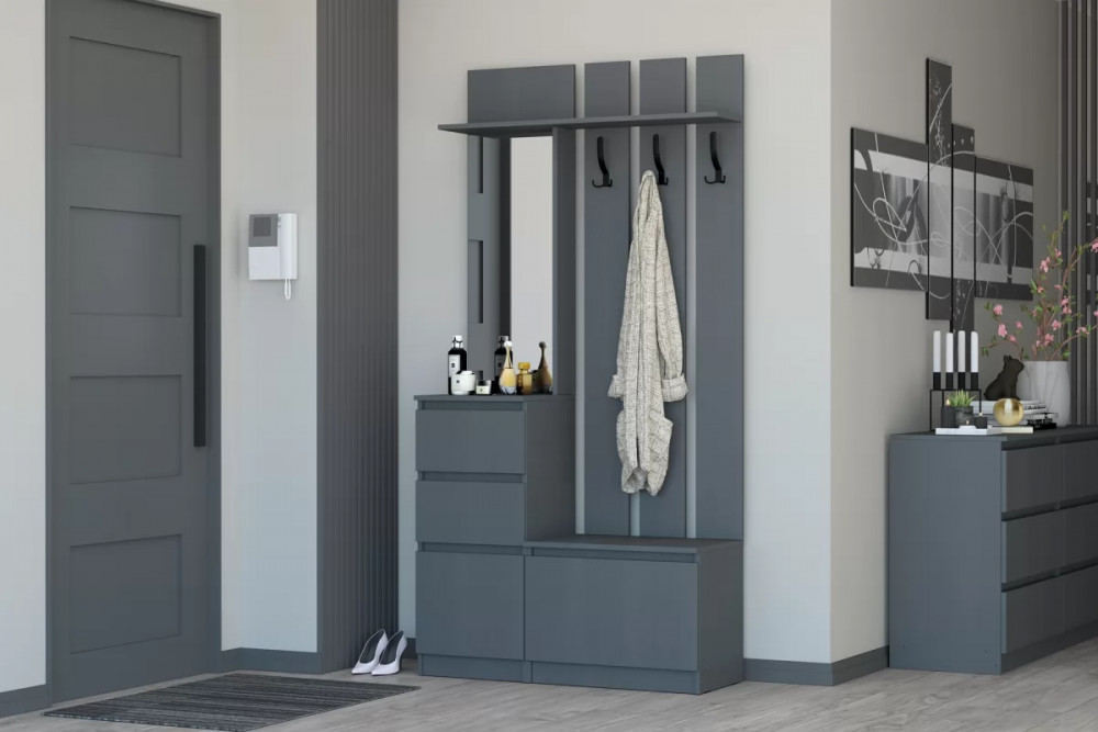 Данная прихожая имеет современный вид, которая впишется в любой интерьер. У данной прихожей 2 выдвижных ящика, 1 распашная и 1 откидная створка, отдел с крючками для верхней одежды. Ящики на шариковых направляющих полного выдвижения размером 300 мм., откидная створка открывается с помощью газлифта. Данная прихожая без ручеек, все створки и ящики открываются с помощью захвата рукой. В отделе с распашной створкой имеется посередине полка (для невысокой обуви), в отделе с откидной створкой можно располагать высокую обувь. Прихожая входит в модульную систему с разнообразным набором модулей: шкафы и кровати разных размеров, письменные столы, комоды, тумбы под ТВ. Благодаря этому можно оформить интерьер всей квартиры в одном стиле.