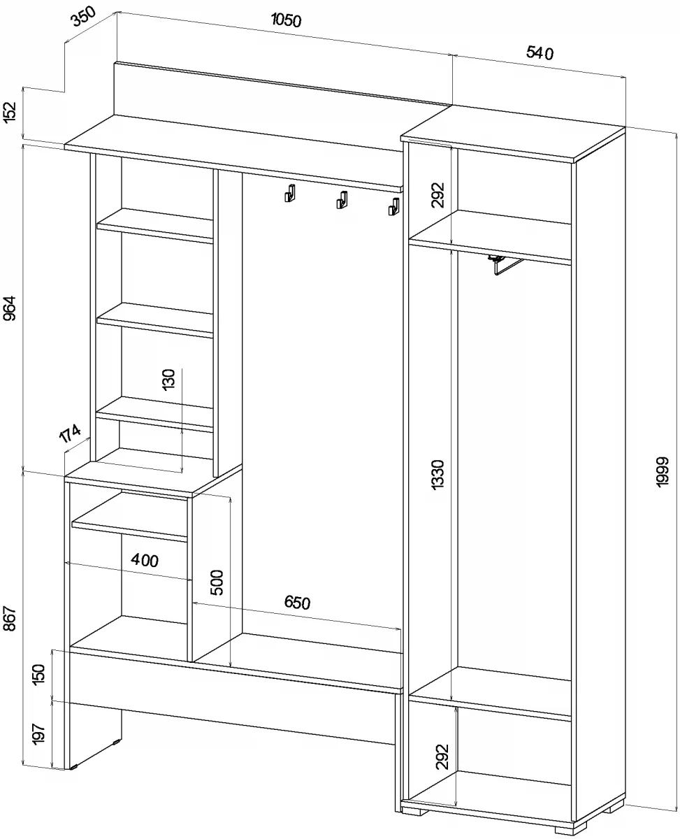 • Габариты: 1590 (ширина) х 350 (глубина) х 1999 (высота) мм.