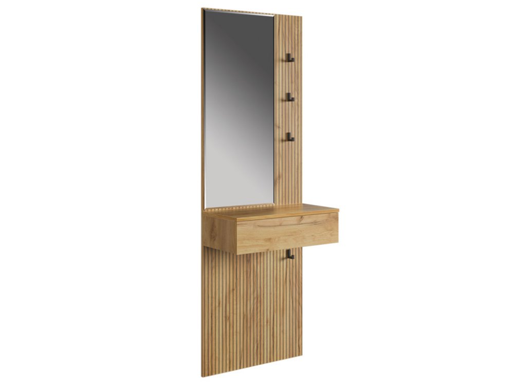 Принт, имитирующий вертикальную фрезеровку, придает зеркалу уникальный и современный вид, добавляя текстуру и глубину. Материал каркаса – ЛДСП, что обеспечивает прочность и долговечность, а также легкость в уходе.