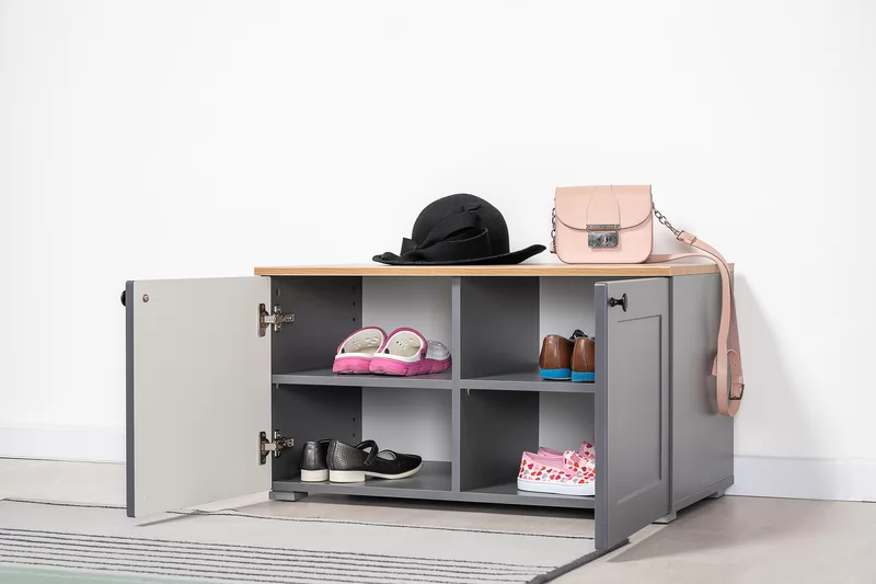 Прихожая доступна в двух цветовых решениях – белый/графит в сочетании с теплым древесным декором.