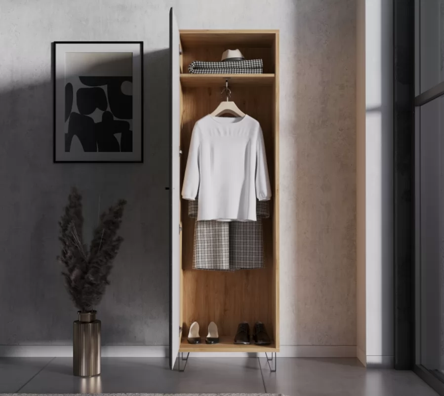 Лаконичный фасад и металлические ножки придают шифоньеру стильный и современный вид. Такая мебельная единица станет акцентным элементом в интерьере, подчеркивая его современный стиль.