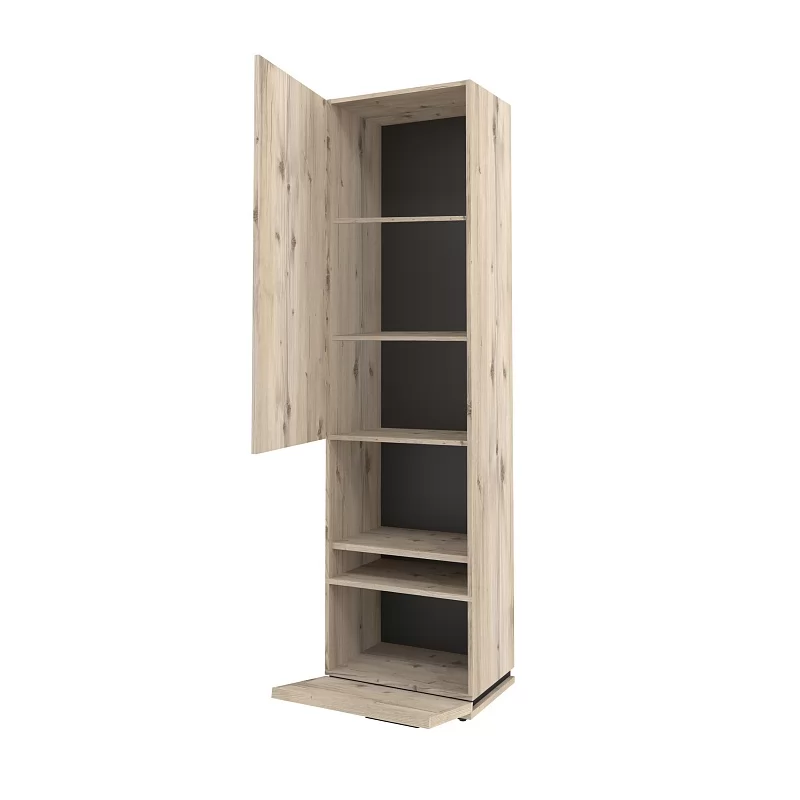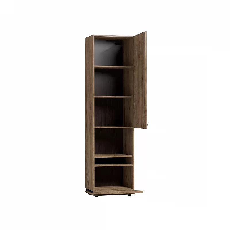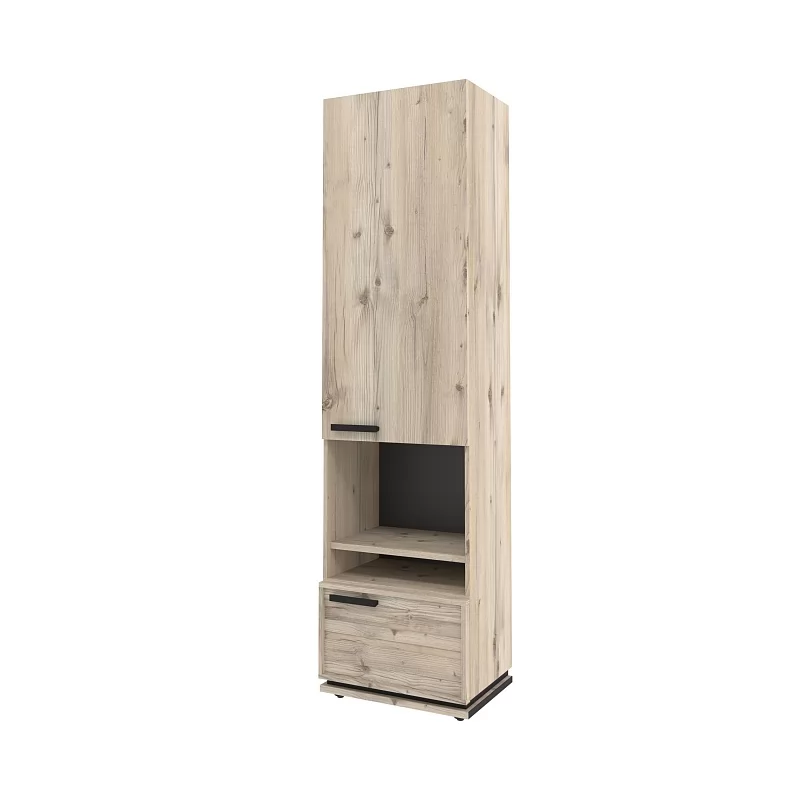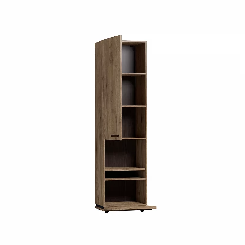 Благородный древесный оттенок шкафа, контрастирующий с черными ручками из массива дерева, подойдет к большинству цветовых решений – мебель будет легко комбинировать с другими предметами. Высокий шкаф МЦН удобен своей функциональностью и эргономичностью конструкции. На открытой полке разместите фотографии или элементы декора, а за глухими фасадами спрячьте документы и ценные вещи от посторонних глаз. Регулируемые опоры шкафа позволят компенсировать незначительные неровности пола.