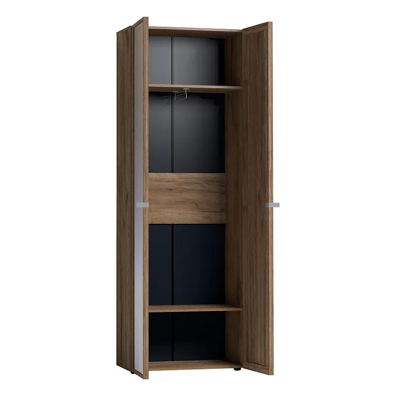 Двухдверный распашной шкаф с одним глухим фасадом и одним зеркальным фасадом в массивной раме Контур. Глухой фасад с ручкой из дерева, которая окрашена в серый цвет. Фасад Зеркало Контур открывается за ручку-петлю из высокопрочной микрофибры. Регулируемые опоры компенсируют незначительные неровности пола.