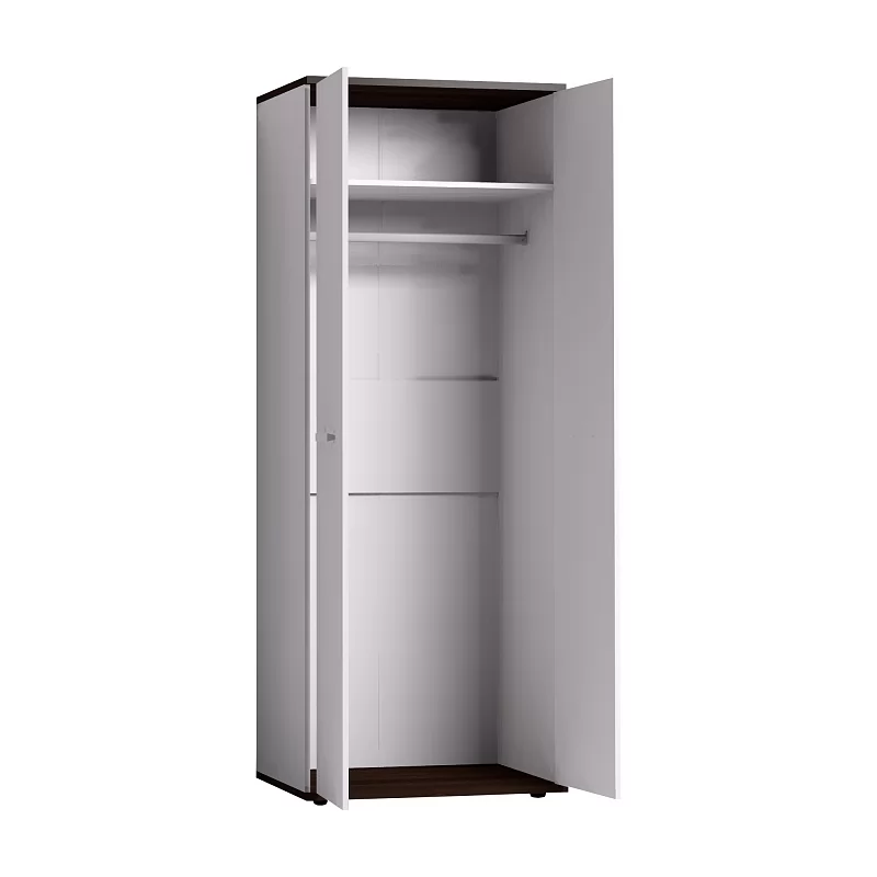 Двустворчатый Норвуд 12 Шкаф для одежды в белом декоре будет уместен как в гостиной, так и в спальне. Контрастный белому декор Орех шоколадный верхней и нижней деталей шкафа придает изюминку этому модулю. Внутреннее наполнение небольшого шкафа состоит из стационарной штанги длиной 757 мм и верхней полки. Распашные фасады шкафа открываются за светлые ручки из массива дерева.