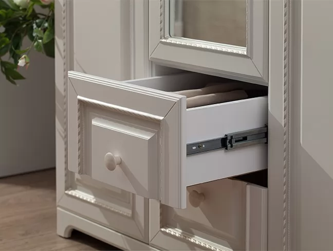 Нет ничего лучше, чем сочетание красоты и практичности. 3-створчатый шкаф «Белла» тому доказательство. Фасады шкафа выполнены в нежном оттенке джелато, дверцы украшены фрезеровкой, а ручки – декоративными кистями. Центральный отсек шкафа оснащен полками, а боковые – штангами для одежды. Выдвижные ящики прекрасно подойдут для хранения вещей.