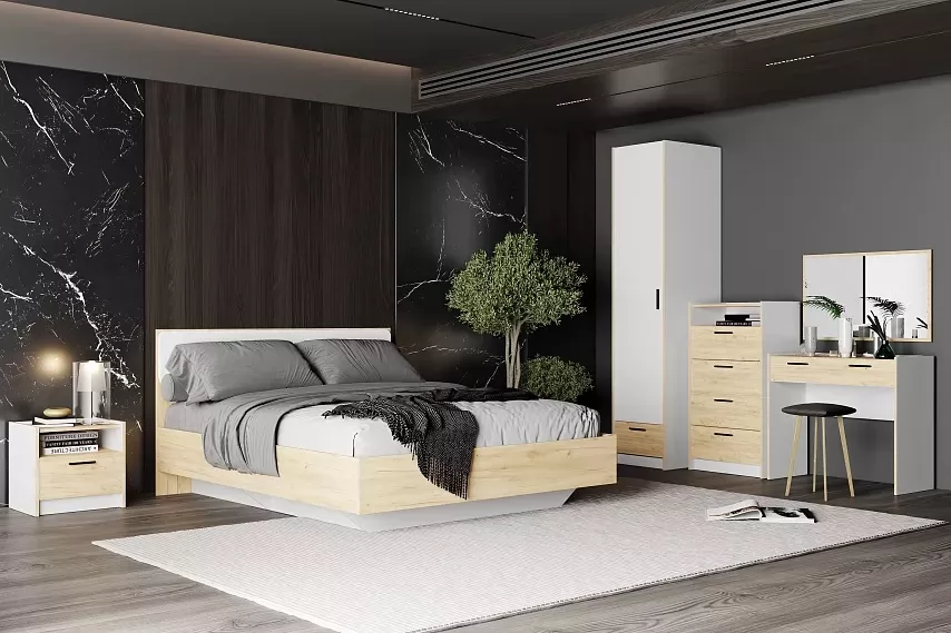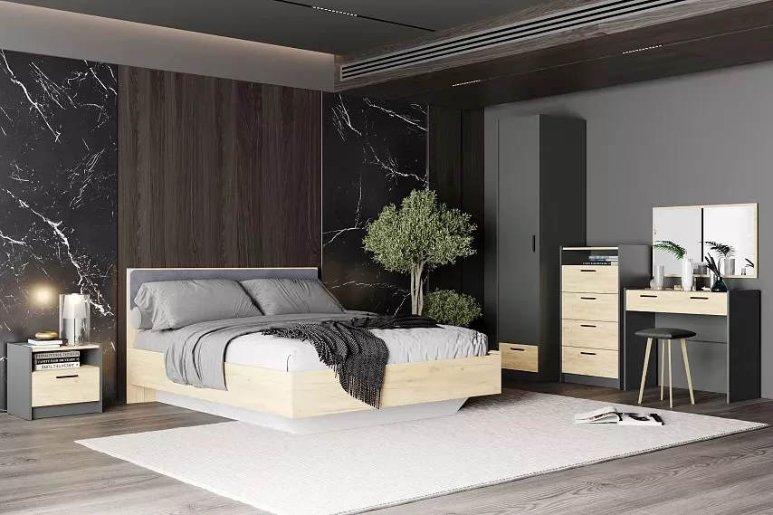 Модульная композиция включает кровать с оригинальным парящим эффектом, который облегчает уборку в комнате, а встроенный газлифт поднимает и надежно фиксирует ортопедическое основание кровати в верхнем положении, обеспечивая максимальный доступ к бельевому ящику. Максимальная нагрузка на одно спальное место – 120 кг. Кровать дополнена прикроватной тумбой с выдвижным ящиком и открытой нишей для хранения вещей. Одностворчатый шкаф оснащен выдвижным ящиком и пятью полками для хранения одежды. Створка может быть собрана как на правую, так и на левую стороны. У комода имеются четыре выдвижных ящика, которые открываются плавно и бесшумно, а также открытая ниша, в которой удобно расположить документы. Туалетный столик оснащен выдвижным ящиком со встроенной перегородкой, где можно легко организовать всю необходимую косметику и украшения. Туалетный столик дополнен зеркалом легкого и лаконичного дизайна.