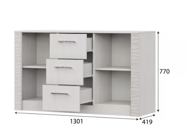 Комод разделен вертикальными перегородками на три отделения. В среднем отделении шириной 365 мм располагаются три выдвижных ящика. По краям модуля располагаются отделения шириной 436 мм с глухими распашными створками. Отделения со створками комплектуются съемными полками, по одной на каждое отделение.Для безударного закрывания распашных створок, в качестве допопции их можно оснастить накладным демпфером.