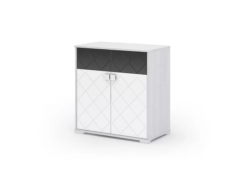 Комод КМ 021 входит в модульный ряд спальни Сальма. Комод Сальма современный и оригинальный, благодаря необычным фасадам, выполненным в декоре Белый глянец с графическим узором линейки и вставкой из стекла черного цвета-лакобель. Комод КМ 021 состоит из 2-х открывающихся дверок и нескольких полочек внутри.
