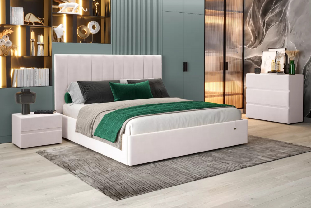 Кровать «Ingrid» подойдет для современных интерьеров спален, впишется в стиль ретро и скандинавский минимализм. Обивка будет отлично сочетаться с любыми цветовыми оттенками отделки и мебели. Кровати выполнены в нейтральных и ярких тканях велюр, что позволяет подобрать подходящий вариант почти под любой интерьер. Изголовье имеет прямоугольную форму, повторяя очертания кровати. Дизайн модели отличается высоким изголовьем с вертикальными строчками и углублениями.