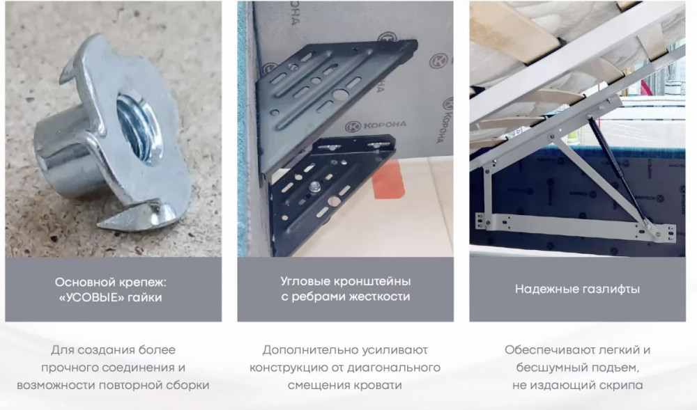 • Имеет полный набор доступных опций: комплектация подъёмным механизмом, настилом ЛДСП, ортопедическим основанием, основанием сплошным ЛДСП.