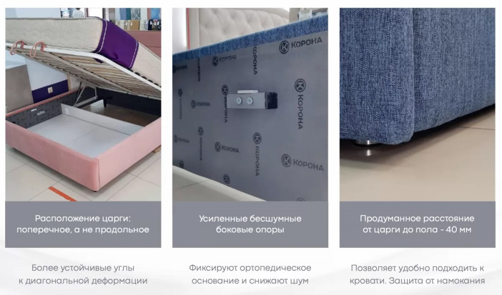 Опора на ножки четко фиксирует каркас и обеспечивает устойчивость спального места. Кровать с опорами удобнее переставлять, исключая механические повреждения. Под мебелью с опорами легче производить влажную уборку, исключая попадание влаги на обивочный материал. В отличии от похожих моделей Jessica 2 и Jessica 3, уменьшена ширина рамки на изголовье до 7 см