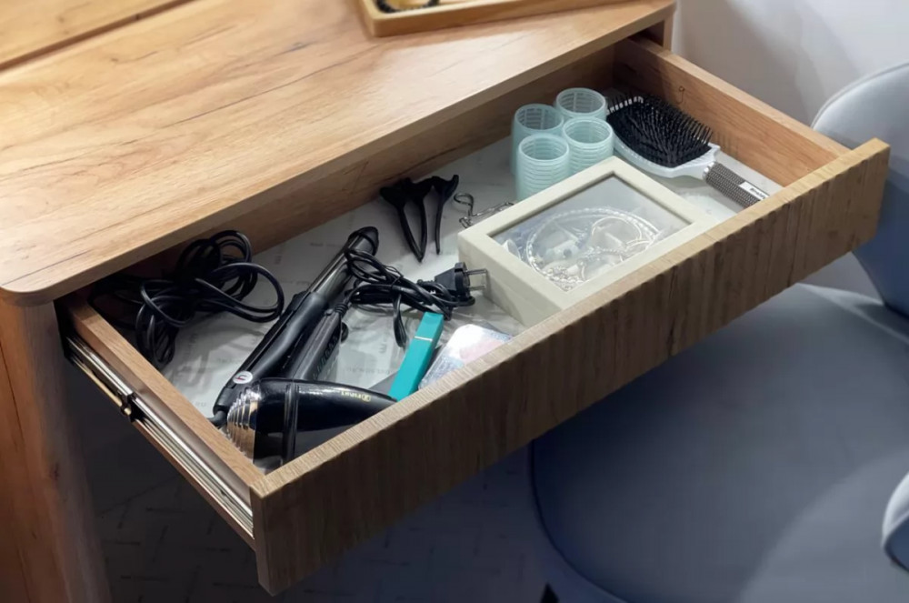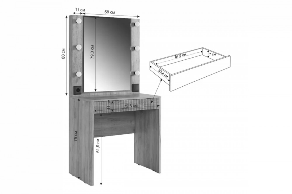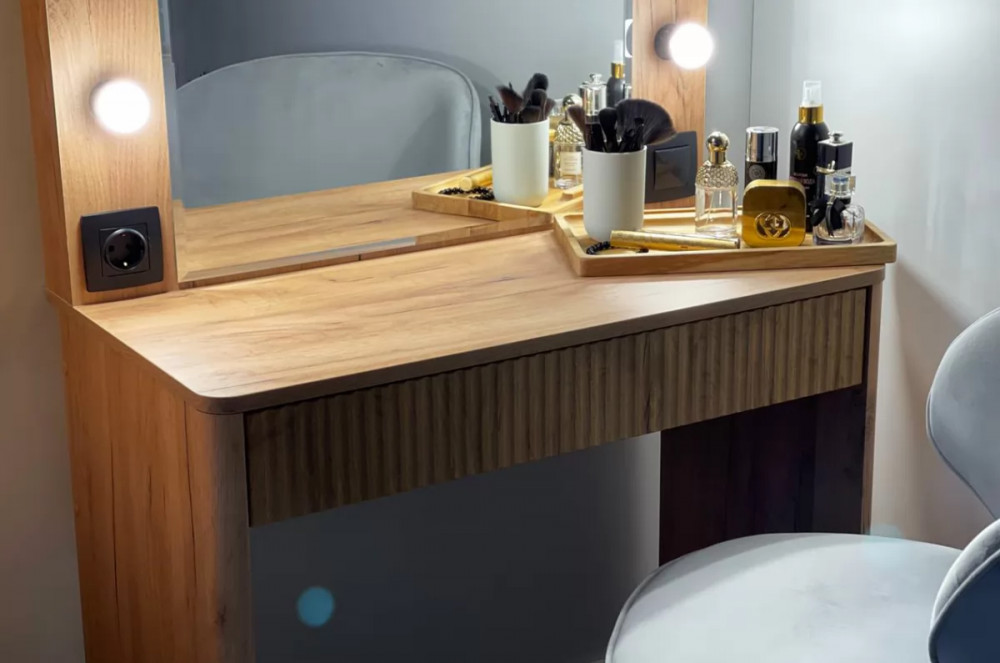 Трюмо Адам — это идеальное сочетание стиля и практичности. С широким фацетированным зеркалом, в котором встроена подсветка из 6 лампочек, оно создает атмосферу профессиональных студий визажистов прямо у вас дома. Комфорт и функциональность обеспечиваются дополнительными элементами, такими как выключатель, розетка для фена и выдвижной ящик для хранения украшений и косметики.