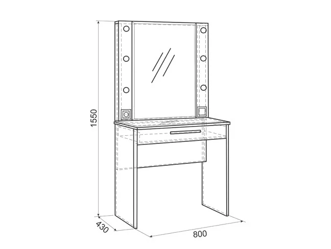 Состоит из зеркала с подсветкой, встроенного выключателя, розетки для фена, выдвижного ящика с бархатным вкладышем для украшений.